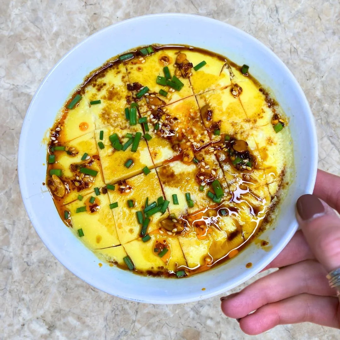 Remove from the heat, slice into squares and add your toppings - enjoy!